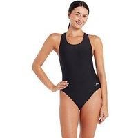 Zoggs Coogee Sonicback Ecolast Swimsuit - Black Set the pace in the Zoggs Coogee Sonicback swimsuit, a great little black swimsuit! Featuring a shelf bra for light support and modesty and medium width supportive straps. This swimsuit also features a closed sonicback design, perfect for enhanced flexibility and freedom of movement in the shoulder blades, so nothing can hold you back in this swimsuit! Made from super soft, quick drying and chlorine resistant Ecolast fabric made from recycled plastic waste... - Manufacturers part number: 462339