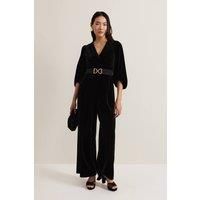 Crafted from a luxe velvet material our Myleen jumpsuit features a feminine V-neckline and cropped puff sleeves, falling to a wide leg silhouette. The matching black belt and statement gold buckle highlight the waist for a sophisticated occasion style. | Phase Eight Women's Myleen Velvet Jumpsuit in Black | Size: 18 - Manufacturers part number: Phase Eight_5057122914864