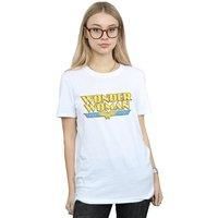 100% ringspun cotton. Fabric: midweight. Design: printed. Neckline: crew neck, lycra ribbed. Sleeve-type: short-sleeved. Branded neck label, single needle stitching, supersoft. 100% officially licensed. Fit: boyfriend. 153gsm. Packaging: swing tag. | DC Comics Women's Wonder Woman Crackle Logo Cotton Boyfriend T-Shirt in White | Size: Small - Manufacturers part numbers: Dc Comics_UTBI19234_white_MP-7813|BILDCC00246-WOM-BOYFT-WHT-S