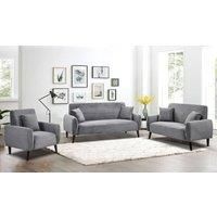 This sofa set includes a 2 seater and 3 seater sofa and a chair. All are upholstered in a soft grey jumbo cord fabric and feature sturdy wooden legs | Comfy Living Ltd Grey Jumbo Cord 3 Seat 2 Seat Arm Chair Sofa Set