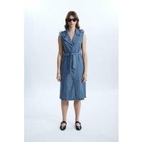 This James Lakeland tailored piece is an all-over dark denim long gilet. Featuring a large classic peaked lapel, epaulet details, and a light denim belt that can be tied at the front or back to cinch in the waits or gather the gilet at the back. This original design will elevate your summer wardrobe. | James Lakeland Women's Long Denim Gilet in Light Blue | Size: 14