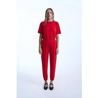 Crafted from technical jersey fabric, these full-length James Lakeland Joggers offer the perfect blend of smart and casual style. The flowy stretch trousers provide exceptional comfort, while details like the ruched elasticated waistband with belt loops, two functional side pockets, and gathered ankles create an elongating effect for the legs. Pair them seamlessly with the Jersey T-shirt and Long Jersey Cardigan to complete a chic ensemble. | James Lakeland Women's Jersey Red Trousers in Light Red | Size: 10 - Manufacturers part number: James Lakeland_5057407733982
