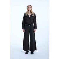 This chic and edgy denim jacket is an original design by James Lakeland. Crafted from sturdy denim fabric, the tailored blouson boasts two functional side pockets, a generous lapel, and long sleeves with tapered cuffs. The striking distress pattern at the back adds a unique touch. Wear it open or zip it up using the clever side zipper, and cinch your waist with the beautiful silver buckle. | James Lakeland Women's Denim Biker Jacket in Black | Size: 18 - Manufacturers part number: James Lakeland_5057407734446