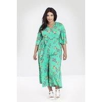Printed viscose jumpsuit Mint base print with painted peach & pink flowers artwork Fitted bodice with V shaped neckline Wide flared sleeves 3 pink buttons on chest Flared culottes from waist Tie at waist in self fabric Zip fastening down centre back Fabric content: 100% Viscose Fit advice: Fabric has no stretch, stick to sizing advised on size guide for bust, waist & hip | Hell Bunny Women's Adelina Mint Green Floral Jumpsuit | Size: 2XL