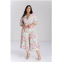 Printed viscose jumpsuit with tie in self fabric Psychedelic pastel base with mushrooms and flowers V neck chestline with round keyhole detail 3/4 flared sleeves Zip fastening on back Wide leg culottes from waist Fabric content: 100% Viscose Fit advice: Fabric has no stretch, but has a loose fit ,stick to sizing advised on size guide for bust, waist & hips. If inbetween sizes, choose the size down Length: Inside leg is 50cm Model: Emily is 5.9ft and wears size XS, Souki is 5.8ft and wears size XL