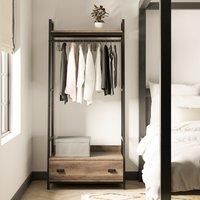 Dunelm Exclusive - Designed and Developed by Dunelm* Pine effect finish* Black metal frame and handles* Hanging rail with shelving space and drawers* Industrial design A modern take on a classic, open wardrobe, this Fulton Open Wardrobe adds a dash of bold style to any home and allows you to showcase your favourite outfits or have your favourite pieces within easy reach. The hanging rail, shelves, and drawer provide plenty of storage space for clothes and shoes. - Manufacturers part number: 30773044