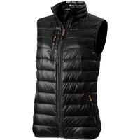 Fairview light down ladies bodywarmer. Downproof pressed fabric. Inner stormflap with chinguard. Tapered waist for a more flattering fit. Chest pocket with zipper closure. Hand pockets with zippers. Elasticated binding. Centre front contrast coil zipper. Hanger loop. Heat transfer main label for tagless comfort. Woven of 100% nylon with dull cire water repellent coating, 20D. 90% down and 10% feathers. 115g/m2. Compliances: APEO, AZO, Formaldehyde, Noncarcinogenic dyestuff, Oeko-Tex Standard 100, Non-al...