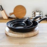 Three durable non-stick frying pans, one great value package. Fry, saut and sear your way to all kinds of delicious meals with these 12cm, 20cm and 28cm aluminium frying pans. Each has a non-stick coating, so you can cook with less oil, enjoy easy food release, and clean up quicker than ever. These small, medium and large pans also boast flat bases, so they'll distribute the heat from your hob quickly and evenly. They're a dream to handle too - soft-grip handle coatings mean you'll never struggle to ... - Manufacturers part numbers: KCFPSET122028|30934098