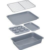 MasterClass Nesting Bakeware Ceramic 5 Piece Set Just the thing for making banana bread, cupcakes and so many more sweet treats, this 5 piece set comprises: - 1 roasting tin - 1 muffin/cupcake tin - 1 cooling rack - 2 baking trays Made from carbon steel, they feature a durable ceramic non-stick that requires little to no greasing, ensuring healthier food. And the best bit is all the pieces nest together, saving valuable cupboard space. They're also covered by the MasterClass lifetime guarantee. Dishwas... - Manufacturers part number: 30848896