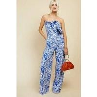 Summer in jumpsuit form. The effortlessly cool alternative to a dress this occasion season, it features a ruffle-trimmed bandeau top, nipped-in waist and flattering wide legs. Accessorise with platforms and a pop of bright lipstick. Print placement may vary. | Little Mistress Women's Blue Floral Print Frill Detail Jumpsuit | Size: 8 - Manufacturers part number: Little Mistress_5057990627606
