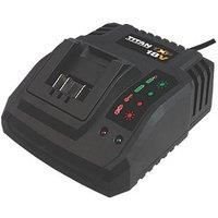2.4A charger compatible with Titan TXP batteries. Charges 1.5Ah batteries in 50 minutes and 2.0Ah batteries in 60 minutes. Charges 18V Batteries - Manufacturers part number: TTB804CHR