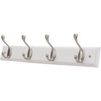 Satin nickel hooks mounted on a white board that maximises wall space. Durable and easy to install. 4 x Satin Nickel Hooks on a White Rail Double-Ended Hook Design Heavy Duty Zinc Alloy Space Saving Easy to Install - Manufacturers part number: 458TA