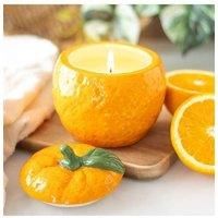Add some zest to your space with this fun candle jar, shaped like a freshly picked orange. Both functional and adorable, this scented candle doubles as a delightful decor item for kitchens, living rooms and more. Approximate burn time of 16 hours. Please practice caution when burning and never leave lit candle unattended. | KDMD Orange Shaped Candle Jar