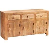 A fabulous collection of contemporary mango furniture made from solid mango hardwood obtained from sustainable sources which is lightly stained and accompanied with a matte finish having simple clean lines to give a natural warm look and maintain the woods natural beauty complemented with matching wooden handles. This extra-large sideboard features 3 drawers and 3 cupboards, each cupboard having one interior shelf. Features: Made from Solid Mango Hardwood Features with three deep drawers and three spaci...