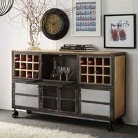 Hand crafted by skilled craftsmen in India this range offers a new dimension to furniture making combining the solid hardwood with reclaimed metal. The range is eco friendly, modern and versatile. The product comes fully assembled. This lovely extra-large sideboard on wheels has natural tone wooden top and sides, combined perfectly with the reclaimed metal to give this unit a distinctive look and practical features. Features: Made from 100% solid hardwood and reclaimed metal Featuring Wine Bottle Holder...