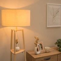 Say hello to Hiru, the natural wood multitasker thats got it all going on! This sleek tripod floor lamp comes with three built-in shelves for styling your fave books, plants or treasures, and a large shade for extra charm, in a range of 4 different colour options to perfectly match your vibe. With its stunning finish and playful design, Hiru brings light, storage, and personality to any corner you call home. | ValueLights Hiru 3 Tier Wooden Shelf Floor Lamp with Large Drum Shade and Bulb in Nude - Manufacturers part number: ValueLights_5059406034626