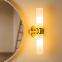 Illuminate your space with this pair of IP44 rated 2 way wall light fittings. Suiting any bathroom, living room, bedroom or hallway, these wall lights feature statement metal in a brushed gold finish with reeded glass shades. The shades not only provide a stylish look but also diffuses the light softly, creating a cosy atmosphere. With a perfect balance of style and functionality, this light brings a touch of modern glamour to any space. | ValueLights Canya Pair of Gold IP44 2 Way Frosted Reeded Glass Wall Lights with LED Bulbs - Manufacturers part numbers: B4124|ValueLights_5059406041242