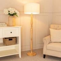 The Victoria candlestick floor lamp fits into both modern and traditional homes, thanks to the light colour of the wood. The wooden base has a classic turned style thats the ideal foundation for the effortlessly elegant linen drum shade with contrasting white trim. Theres a 1.8m cable from plug to lamp, and an in-line foot switch, too. | ValueLights Victoria Light Wood Candlestick Floor Lamp with Linen White Trim Drum Lamp Shade in Natural