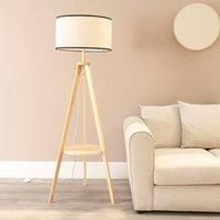 The Morrigan tripod floor lamp is a perfect example of working smarter, not harder. It features a handy built-in shelf, making it a fantastic 2-in-1 piece. The light wood finish pairs beautifully with the natural linen shade, which comes in two trim options - white and black. The shelf can be personalised with your own bits and bobs or can be left empty as a style statement on its own. Theres a 1.8m cable running from plug to lamp, and an in-line foot switch, so user (and back) friendly! | ValueLights Morrigan Natural Wood Tripod Floor Lamp with Linen Trimmed Drum Shade in Black - Manufacturers part numbers: ValueLights_5059406056840|B5684