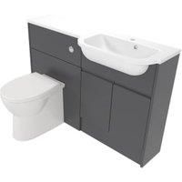 A run of slimline fitted bathroom furniture with a total width of 1200mm featuring a 600mm vanity unit a 600mm toilet unit and colour-matched plinth and end panels. Complete with a Coniston back-to-wall pan with a soft close seat and a concealed cistern with a chrome flush button. Finished with a one-piece integrated cast basin and worktop.