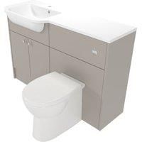 A run of fitted bathroom furniture with a total width of 1242mm featuring a 600mm basin unit and a 600mm toilet unit and colour-matched plinth and end panels. Complete with modern chrome knurled handles a Coniston back-to-wall pan with a soft close seat and a concealed cistern including chrome flush button. Finished with a one-piece integrated cast basin and worktop.