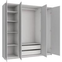 Our Claydon Slab Quad Wardrobe with Plinth & Panels is all you need to create a seamless 2.1m wardrobe with a rail shelves and drawers. Featuring four doors in a contemporary grey matt finish a colour matched plinth and end panels. Cabinet and interior are easy to assemble please note both the plinth and end panel need to be cut to size. Wardrobe includes a hanging rail two soft-close drawers and six shelves offering additional storage for your clothes and accessories. Please note handle holes are not p...
