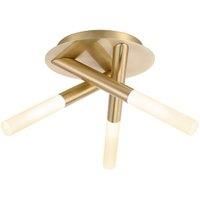 The Spa Crux Ceiling Light features a unique semi-flush form with three decorative angled tubular arms and glass shades seated on a satin brass ceiling plate. Crafted from durable metal and glass finished in elegant satin brass for a contemporary look.