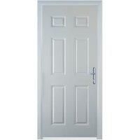 The Door-Stop 6 Panel White Left Hand FD30 Integral Garage Fire Door Set is designed for internal use in homes serving as an integral garage door. It features a stylish six-panel design with a sleek white GRP finish on both sides and is left-hand hung in a durable white veka chamfered uPVC frame.