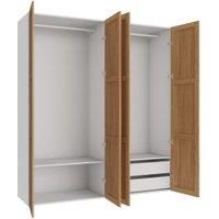 Our Ashland Shaker Quad Wardrobe is all you need to create a 2.25m wardrobe with a rail shelves and drawers. Designed with four doors in a stylish warm oak finish this wardrobe includes a hanging rail two soft-close drawers and two shelves offering additional storage for your clothes and accessories. Please note handle holes are not pre-drilled to allow for choice of style open height and handle length. Handles sold separately.