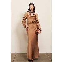 TFNC Occasion Dress - Cold Shoulder - Long Sleeve - Spaghetti Straps - Satin - Deep V Back - Maxi length Material: 100% Polyester. Care: Hand wash only | TFNC London Women's Vivian Mocha Maxi Dress in Light Brown | Size: 10