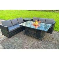 Weather-proof: This classic rattan set has been designed with the British weather in mind and has been made from durable materials designed to withstand the outdoors all year long. Garden Dining: Get a six-seater garden rattan set today! Includes: Includes two three-seater corner sofas, one corner table and one dining table. Fire Pit: With a built-in gas fire-pit dinning table, you can enjoy a fire light dinner with warm welcoming aesthetic all summer long. Cushions: Featuring removable machine washable...