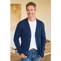 Crafted from pure cotton thats too good to resist, we love this relaxed cardi in an array of new seasonal colourways. Designed with an all-over cable knit and button-through front, itll see you through those confusing transitional months layered over everything from signature denim to our must-have base layers. Finished with twin front welt pockets, it wears beautifully too, thanks to the shape-saving rib on the cuffs and hem. | Cotton Traders Men Cotton Cable Button Through Cardigan in Navy | Size: X-S...
