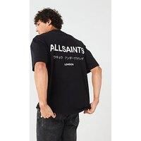 AllSaints Underground Back Print T-shirt Size & Fit True to size Relaxed fit Model is 6'1", a standard size Medium and is wearing size M Details Underground Back Print T-shirt by AllSaints Black Made from soft and breathable lightweight cotton Contrasting AllSaints branding printed to the chest and back Crew neck Dropped shoulder seams Short sleeves Cut to a relaxed, boxy silhouette Material Material Content: Cotton. Washing Instructions: Machine Washable