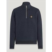 Belstaff Quarter Zip Crew Sweat - Navy Size & Fit True to size Regular fit Model is 6'0", a standard size Medium and is wearing size M Details Quarter Zip Sweatshirt by Belstaff Navy Made from soft-handle knitted cotton Features the signature Belstaff logo patch stitched-in at the chest High neckline Quarter-length zip fastening Long sleeves Ribbed trim to the cuffs and hemline Regular fit through the body Material Material Content: 100% Cotton Washing Instructions: Machine Washable