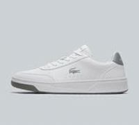 Lacoste Court Pro Trainers in White and Grey. Featuring the style's signature panels, the slick PU leather upper looks and feels like the real thing whilst the soft and breathable mesh lining ups the comfort stakes. With perforations, woven tongue label, rubber outsole and debossed famous crocodile branding to the quarter. White Size - 8.5