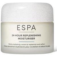 ESPA 24-Hr Replenishing Moisturiser A richly hydrating face cream to leave skin feeling replenished and soft. Myrrh, Frankincense and Neroli replenish, while Vitamin E helps protect the skin barrier. Nourishing Evening Primrose and Jojoba also work to deeply moisturise leaving skin silky smooth. Depth: 48 MM Height: 63 MM Width: 65 MM