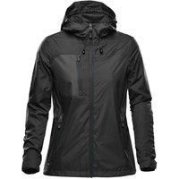 Material: Polyester. Design: Plain. Branded Zip Pull, Contrast Zip, Inner Zip Guard, PFC Free, Taped Seams. Fabric Technology: DWR Finish, H2XTREME, Ripstop, Showerproof. Cuff: Adjustable, Tear Release. Neckline: Hooded. Sleeve-Type: Long-Sleeved. Hood Features: Adjustable, Grown On Hood. Pockets: 1 Chest Pocket, Zip. Fastening: Full Length. Waterproof Rating: 5000mm. 5000g/m/24hrs. Hem: Branded, Drawcord. | Stormtech Women's Olympia Soft Shell Jacket in Black | Size: Medium