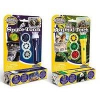 Space and Animal Torches & Projectors (2 pack) This fantastic torch pack comes with six slide discs with 24 colour NASA photographs and 24 colour wildlife images. Swap and change the slides easily by pulling back the plastic flap and inserting the chosen disc then rotate the disc round to view the fantastic colour images which project up to one meter wide. Images are easily focused by turning the lens head. It can also be used as a normal torch without the slides in place and is great for keeping on bed...