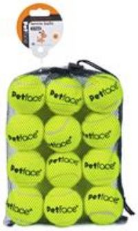 Petface 12 pack of Tennis Balls for games of throw and fetch. Promotes dog fitness with active play. Made from rubber. H27, W20, D7cm. Weight 0.65kg. Manufacturers 1 year guarantee. EAN: 5060253807028.