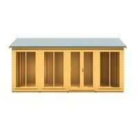 The Mayfield is a stunning summerhouse with a fully glazed front providing lots of natural light, the glass is toughened for your safety. There are useful double doors giving easy access and these are also lockable. This lovely garden room is constructed from high grade 12 mm pine shiplap boards over sturdy 44 mm x 44mm framing. The floor and roof are 12 mm T&G with mineral roof felt provided to complete the roof exterior. The windows and doors are of joinery made quality and of a storm-resistan...