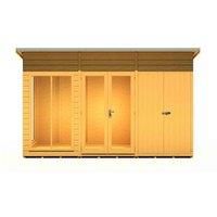 This stylish Lela Summerhouse with its versatile design, cleverly incorporates a separate storage room and is a valuable addition to your outdoor living. With an eaves height of around 7 ft high, the Lela provides a very comfortable, spacious interior. This modern garden room is perfect for summer dining and relaxing. The joinery made double doors are fitted with a mortice lock and the single door has a padbolt ready for your own padlock. The double doors and fixed windows are glazed with styrene safety...