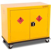 Hazardous mobile cupboard with nylon castor wheels. Designed to be used internally for the safe storage of flammables and chemicals. Galvanised shelves and liquid-tight sump to contain spillages. All-Steel Construction 2 Keys Supplied 30 Minute Fire-Resistant Flush Handles with 2-Point Locking Hazardous Warning Signs - Manufacturers part number: HMC1