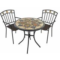 DARWIN 76cm Bistro Table with 2 MALAGA Chairs Set The hand laid mosaic natural stone and ceramic tiles have a slightly rough texture giving an earthy feel to this bistro table, the grouting in between the tiles enhances the slightly tumbled edges of each mosaic section. The decorative embossed metal table edge is finished in black to match the table legs and the table features a parasol hole in the centre but a matching cap is included. For use outdoors but can also be used inside. Would comfortably sea...