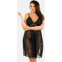 Simple, seductive and feminine, you cant go wrong with this gorgeous nightwear set. Coming complete with a matching thong, you gain a whole new outfit for your wardrobe and the opportunity to show off your curves to their full potential. The soft black sheer lace will fall elegantly around you, creating the illusion of a solid black silhouette, with glimpses of skin peeking through. The design features structured black triangular cups with lace detailing, and adjustable straps to achieve the perfect fit...