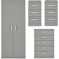 This great value Ready Assembled Bedroom Furniture Package Deal from One Call's Sanford Collection comprises a 2 Door Wardrobe, Chest of 5 Drawers and 2 Bedside Chests Let your sleep space shine with a little help from One Call's Sanford collection! This ultra modern ready assembled bedroom furniture set flaunts a fashionable high gloss finish to the doors and drawer fronts, which ensures the soft colour choice of dark grey and white really pops. The wardrobe contains a hanging rail and high shelf, wh...