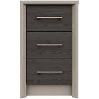 Smyth Ready Assembled 3 Drawer Bedside Chest in Taupe/Dark Grey or Taupe/Light Grey - Made in the UK Ultra modern, this UK made Smyth bedside chest has a taupe painted look to the frame and boasts smartly angled front edges. The taupe colour contrasts eye-catchingly with grained-effect drawer fronts that come in a choice of light grey or dark grey. They're accented with slim D shaped handles in a striking brushed nickle/pewter, while drawers are finished with linen look interiors and metal runners that...