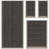 This great value for money 3 Piece Ready Assembled Bedroom Furniture Set from our Smyth Collection contains a 2 Door Wardrobe, Chest of 5 Drawers plus a pair of 3 Drawer Bedside Chests. Modern and stylish, this UK made Smyth set will reinvent your bedroom in one easy purchase. The taupe frames boast smartly angled front edges, and the colour contrasts eye-catchingly with grained-effect doors and drawer fronts that come in a contrasting choice of light grey or dark grey. They're accented with slim D sha...