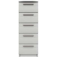 Taylor Ready Assembled 5 Drawer Tall Boy in Light Grey, Graphite and White - Made in the UK Ready made* for the ultimate ease, this chest of drawers from the Taylor collection has been crafted right here in the UK. Finished in a realistic wood grain finish, you can pick from the modern palette of light grey, graphite and white. Styled with a rounded front edge to the top, the five drawer fronts are finished with a tongue-and-groove style finish and modern metal handles that put some shine into your slee...