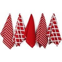 Penguin Home - 100% Cotton Tea Towel Set of 5 - Soft - Durable - Stylish Red Design with Multiple Patterns - Machine Washable - 65 x 45cm