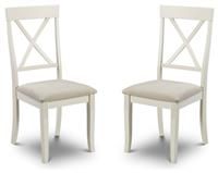 Julian Bowen Set of 2 Davenport Solid Wood Dining Chairs in Ivory Crafted from solid rubberwood in a smooth lacquered ivory finish, these Davenport dining chairs from Julian Bowen feature comfy padded seats with a matching ivory coloured faux suede upholstery. The front legs are beautifully detailed with decorative moulding to give them an extra touch of traditional style. Dimensions: Height 96.5, Width 44, Depth 52 cm Assembly: Self Assembly Material Content: Rubberwood, Foam & Fabric Lacquered finish ... - Manufacturers part numbers: DAV003|30667049